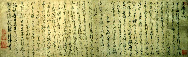 解缙,1369年生,1415年逝世 ,江西吉水(今江西吉水)人。明代书家。字大绅,一字缙绅,号春雨。洪武进士,官至翰林学士。自幼颖悟绝人,其文雅劲奇古,诗豪放羊瞻,书小楷精绝,行、草皆佳。狂草名一时,然纵荡无法。明吴宽《匏翁家藏集》称:“永乐时,人多能书,当以学士解公为首,下笔圆滑纯熟。”所书小楷《黄庭》,全摹临右军,笔婉丽端雅。”著有《文毅集》、《春雨杂述》等。于书法屡有论述。墨迹有《自书诗卷》、《书唐人诗》等。《自书诗卷》,章草,纸本墨迹。纵34.5厘米,横470.8厘米,藏故宫博物院。此卷是在永乐八年(1410)解缙被贬官后,于南京寓居处信笔而成。整个作品中锋用笔,圆转纯熟,行笔迅急,气势奔放,犹如泉涌,一泄到底,极富于抒情和表现。从整个作品来看,他的书法以“二王”为基础,流露出《圣教序》的韵味,书体草中有行,行中有草,线条流畅,体势舒展,显得很坦荡。笔画粗细不一,曲折多变。有时笔画颠狂翻腾,错综复杂,特别是竖画的纵笔,毫不迟缓,一蹴而就。尤其到了卷尾“付于有识者自辨之”几个字,狂放不羁,气势升华到了极致,很像《自叙帖》的笔意,显得很浪漫。这件佳作,是作者长期艺术追求和长期实践经验的结晶。
